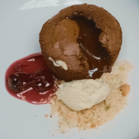 Šokoladinis lavos pyragėlis su mascarpone ir vyšnių padažu